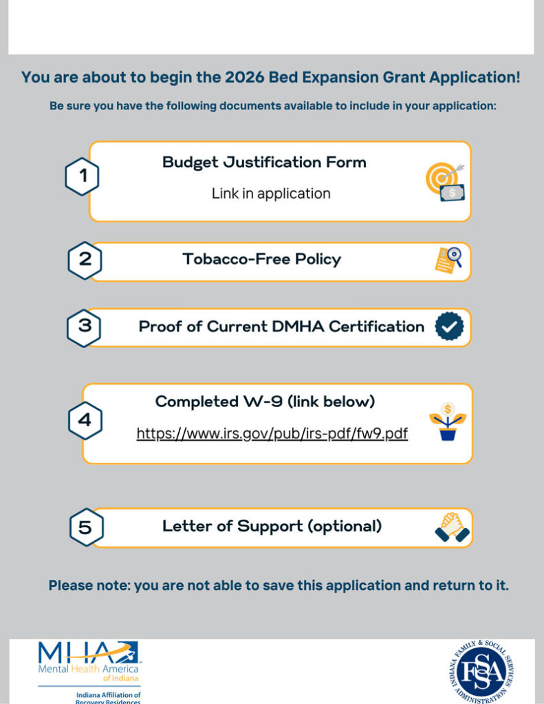 Home / Request for Proposal / Application for Grant FundingApplication for Grant Funding Please enable JavaScript in your browser to complete this form. - Step 1 of 2Requesting Agency: *Project Name: *Funding Request: *Total Cost of Project/Program: *Brief Description of Project: *(Please be specific. Limit 500 words)Name of Organization: *Address *Address Line 1Address Line 2CityAlabamaAlaskaArizonaArkansasCaliforniaColoradoConnecticutDelawareDistrict of ColumbiaFloridaGeorgiaHawaiiIdahoIllinoisIndianaIowaKansasKentuckyLouisianaMaineMarylandMassachusettsMichiganMinnesotaMississippiMissouriMontanaNebraskaNevadaNew HampshireNew JerseyNew MexicoNew YorkNorth CarolinaNorth DakotaOhioOklahomaOregonPennsylvaniaRhode IslandSouth CarolinaSouth DakotaTennesseeTexasUtahVermontVirginiaWashingtonWest VirginiaWisconsinWyomingStateZip CodePhoneFaxEmail *Project Address: *Address Line 1Address Line 2CityIndianaAlabamaAlaskaArizonaArkansasCaliforniaColoradoConnecticutDelawareDistrict of ColumbiaFloridaGeorgiaHawaiiIdahoIllinoisIndianaIowaKansasKentuckyLouisianaMaineMarylandMassachusettsMichiganMinnesotaMississippiMissouriMontanaNebraskaNevadaNew HampshireNew JerseyNew MexicoNew YorkNorth CarolinaNorth DakotaOhioOklahomaOregonPennsylvaniaRhode IslandSouth CarolinaSouth DakotaTennesseeTexasUtahVermontVirginiaWashingtonWest VirginiaWisconsinWyomingStateZip CodeContact Person: *Address *Address Line 1Address Line 2City--- Select state ---AlabamaAlaskaArizonaArkansasCaliforniaColoradoConnecticutDelawareDistrict of ColumbiaFloridaGeorgiaHawaiiIdahoIllinoisIndianaIowaKansasKentuckyLouisianaMaineMarylandMassachusettsMichiganMinnesotaMississippiMissouriMontanaNebraskaNevadaNew HampshireNew JerseyNew MexicoNew YorkNorth CarolinaNorth DakotaOhioOklahomaOregonPennsylvaniaRhode IslandSouth CarolinaSouth DakotaTennesseeTexasUtahVermontVirginiaWashingtonWest VirginiaWisconsinWyomingStateZip CodePhoneEmail *FaxWebsite / URL1. Describe how your project addresses the need for increase in bed capacity and how many beds will be added. [Limit 300 words]2. What steps or activities or funds need to be taken/provided prior to the implementation of this project? [Limit 300 words] *3. At the completion of this project, what further steps or activities or funds need to be taken/provided to fulfill the goal of increasing bed capacity? [Limit 300 words] *4. Provide local data/information that demonstrates the need for this recovery residence bed expansion in your community. [Limit 400 words] *5. Describe actions/activities/services to be provided and timeline for implementation. [Limit 300 words] *6. Describe how you will evaluate the project/program. [Limit 300 words] *7. What other community partners/agencies are sharing or will share in the responsibility of the project or providing any in-kind contributions (please include letter(s) of support, if available)? *Upload Letter of Support, if available Drag & Drop Files, Choose Files to Upload You can upload up to 3 files. 8. Upload completed Budget Justification Form. Download form below. Drag & Drop Files, Choose Files to Upload You can upload up to 3 files. Download Budget Justification form here 9. What is the total cost of the comprehensive project/program, if these funds do not complete project/program? *10. Please attach documentation reflecting current DMHA Certification as level II, III, or IV Recovery Residence. Drag & Drop Files, Choose Files to Upload 11. Please attach documentation of IRS Designation as Not-For Profit organization (if applicable). Drag & Drop Files, Choose Files to Upload 12. Please upload a copy of your company's Tobacco-Free Policy. Drag & Drop Files, Choose Files to Upload Please upload a copy of a completed W-9. Implementing Agency Signatures We, the undersigned, have read and agree to comply with the aforementioned terms, conditions, requirements, and deadlines. We realize that failure to do so may result in the denial of future funding requests. Name of Applicant (Organization) *Date *Director of Agency *Signature * Clear Signature Please contact Kat Stuart, INARR Recovery Residence Support Manager via email at kstuart@mhai.net with any questions or concerns. Next INARR Code of Ethics Assess each potential resident’s needs and determine whether the level of support available within the residence is appropriate; Provide assistance to the resident for referral in or outside of the residence. Value diversity and non-discrimination. Provide a safe, homelike environment that meets NARR Standards. Maintain an alcohol- and illicit-drug-free environment. Honor individuals’ rights to choose their recovery paths within the parameters defined by the residence organization. Protect the privacy and personal rights of each resident. Provide consistent and uniformly applied rules. Provide for the health, safety and welfare of each resident. Address each resident fairly in all situations. Encourage residents to sustain relationships with professionals, recovery support service providers and allies. Take appropriate action to stop intimidation, bullying, sexual harassment and/or otherwise threatening behavior of residents, staff and visitors within the residence. Take appropriate action to stop retribution, intimidation, or any negative consequences that could occur as the result of a grievance or complaint. Provide consistent, fair practices for drug testing that promote the residents’ recovery and the health and safety of the recovery environment and protect the privacy of resident information to the extent allowed by law. Provide an environment in which each resident’s recovery needs are the primary factors in all decision making. Promote the residence with marketing or advertising that is supported by accurate, open and honest claims. Decline taking an active role in the recovery plans of relatives, close friends, and/or business acquaintances who may apply to live in the recovery residence. Sustain transparency in operational and financial decisions
